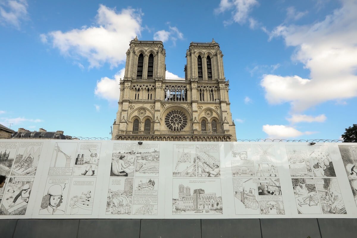 O incêndio de 15 de abril de 2019 destruiu parte do telhado e provocou o desabamento da agulha central, mobilizando um esforço internacional de recuperação. Mais de 700 milhões de euros foram arrecadados para financiar os trabalhos, que envolveram cerca de 250 empresas especializadas em restauro, engenharia, carpintaria, vitralaria e escultura.